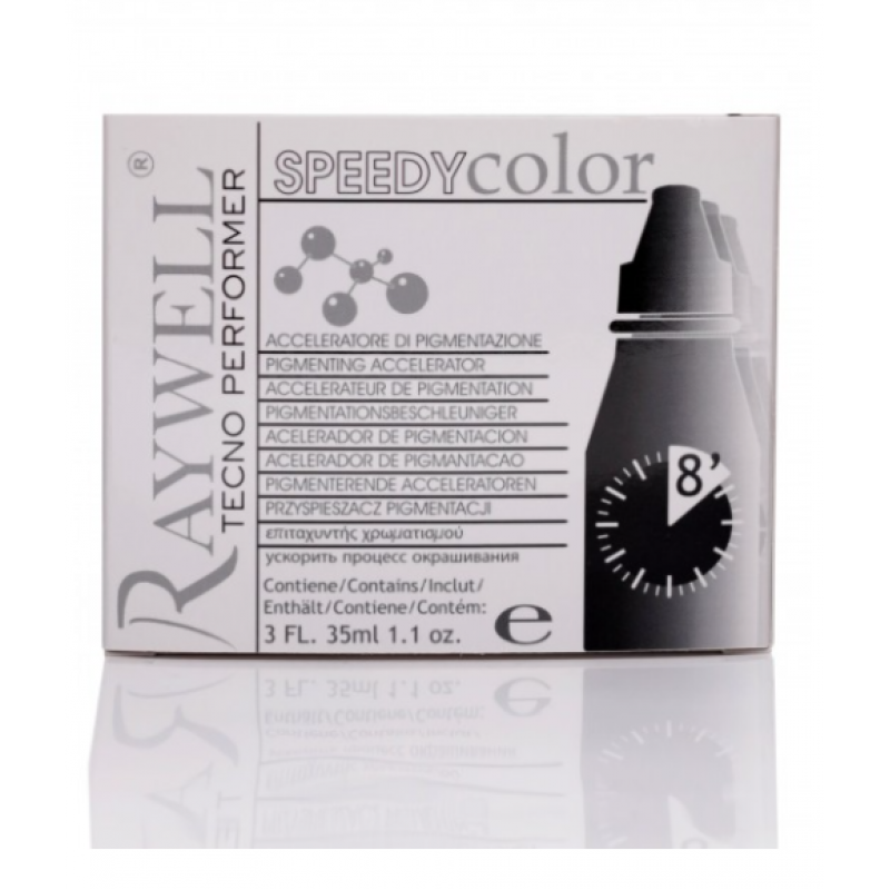 Краплі додаються безпосередньо у фарбувальну суміш, підсилюючи пігмент і скорочуючи час проявлення кольору. Raywell Speedy Color дозволяє досягти більш виразного відтінку, покращити покриття сивини та зробити колір більш однорідним і блискучим.