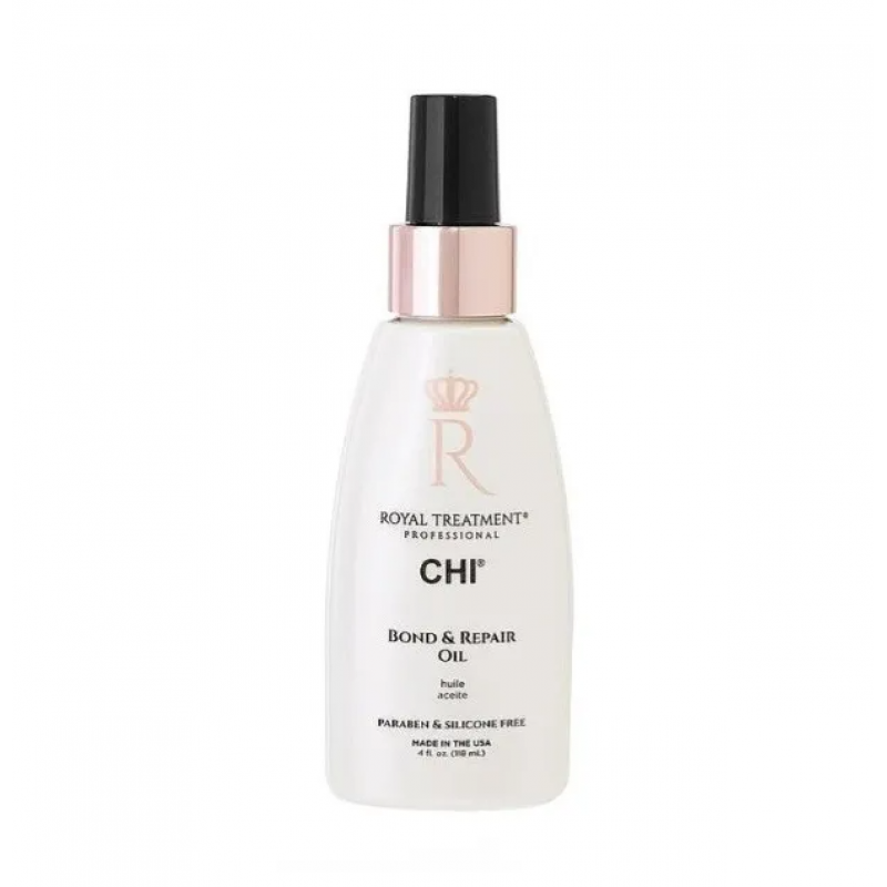 CHI Royal Treatment Bond & Repair Oil 118 мл — професійне рішення для внутрішнього зміцнення зв’язків, захисту та відновлення пошкодженого волосся, що поєднує bond-repair технологію з натуральними поживними компонентами для досягнення міцного, блискучого та здорового результату без силіконів та обтяження.