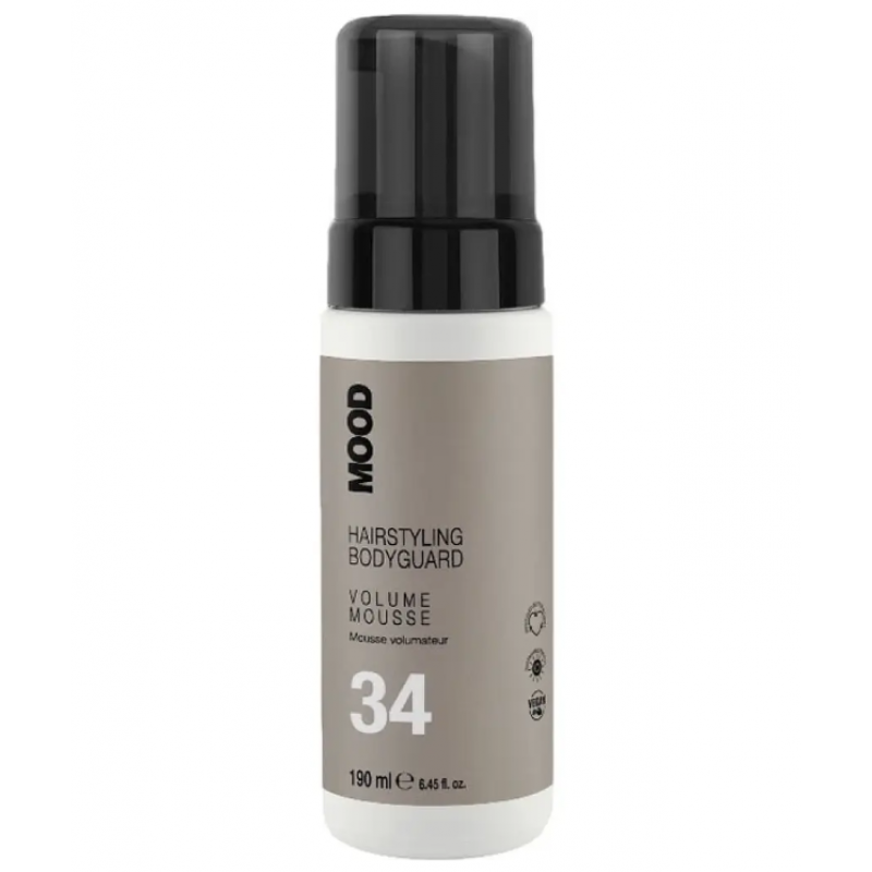 Мус має легку повітряну текстуру, яка рівномірно розподіляється по волоссю, не обтяжує його та не створює ефекту склеювання. Mood 34 Volume Mousse допомагає сформувати об’ємні зачіски, підсилює густоту волосся і забезпечує середню фіксацію, що зберігає природний вигляд укладки. Засіб піднімає волосся біля коренів, додає щільності по довжині та полегшує процес моделювання зачіски.