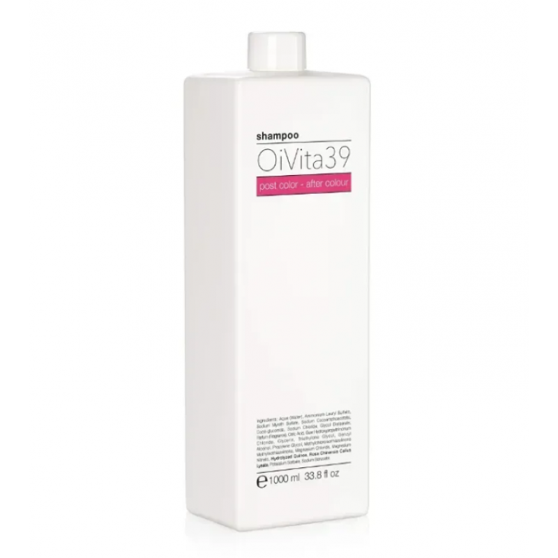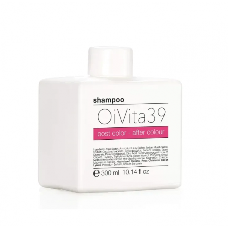 OiVita39 AfterColor — професійний шампунь, розроблений для делікатного очищення та збереження інтенсивності кольору після фарбування й хімічних процедур. Формула шампуню м’яко видаляє забруднення, підтримує оптимальний гідроліпідний баланс і допомагає продовжити яскравість та насиченість відтінку.