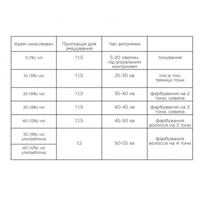 МІКС 1:1,5) змішайте 100 гр фарби з 150 г обраного крему Oxigen Pro.Cream відповідно до бажаного тону. Для серії суперосвітлювачів (MIX 1:2) змішайте 100 г кольорового крему з 200 г крему Oxigen Pro.Cream. Змішуйте до отримання однорідної кремоподібної маси.