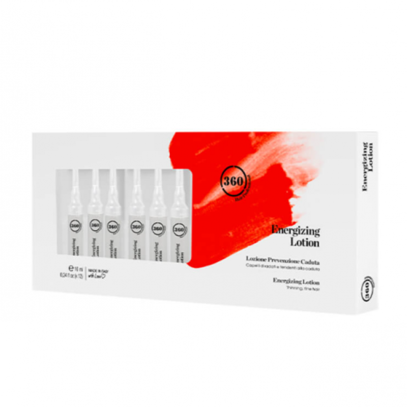 360 Hair Professional — італійський бренд професійної косметики для волосся, який поєднує інноваційні технології та активні комплекси для досягнення видимих результатів. 360 Energizing Lotion 12×10 мл створений як інтенсивний курс проти випадіння волосся з високою концентрацією стимулюючих компонентів.