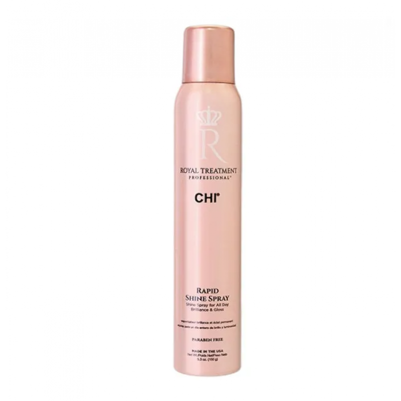 CHI Royal Treatment Rapid Shine Spray — професійний легкий спрей для фінішного блиску об’ємом 150 мл, що входить до преміальної лінійки Royal Treatment від бренду CHI (Farouk Systems, США). Продукт призначений для надання миттєвого діамантового сяйва, гладкості та здорового вигляду всім типам волосся, включаючи пошкоджене, фарбоване, тонке, пористе або схильне до пушіння.