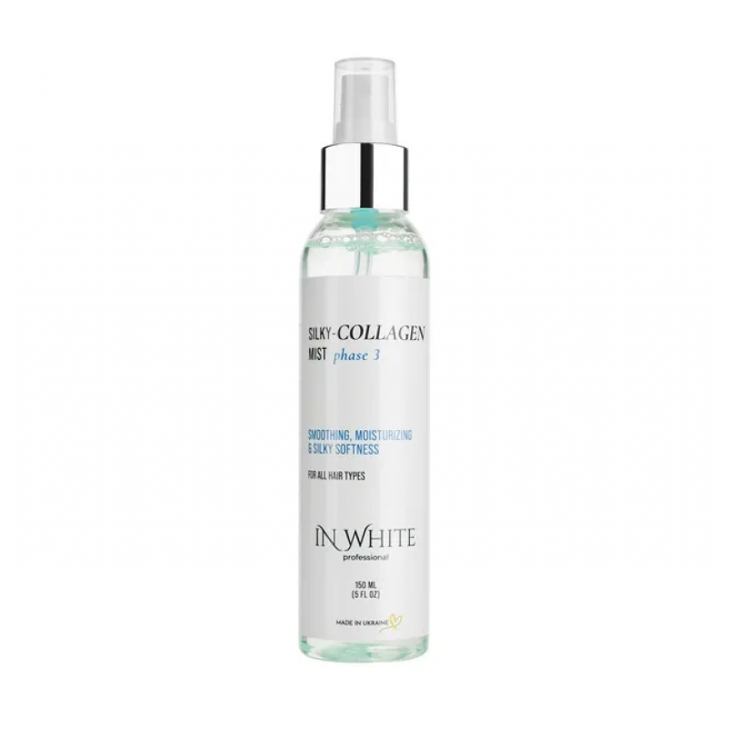 IN WHITE Professional SILKY-Collagen Mist 150 мл – це сучасний засіб для щоденного догляду за волоссям, який поєднує функції розгладження, відновлення та термозахисту. Завдяки поєднанню колагену, кератину та протеїнів шовку спрей допомагає зробити волосся гладким, сильним і блискучим, захищаючи його від пошкоджень і втрати вологи.
