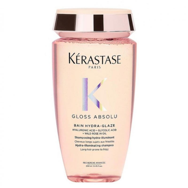 Зволожувальний шампунь-ванна для блиску довгого, неслухняного волосся – Kérastase Gloss Absolu Bain Hydra-Glaze Shampoo 250 мл — професійний шампунь для делікатного очищення, інтенсивного зволоження та надання дзеркального блиску довгому волоссю, схильному до пухнастості та втрати гладкості.